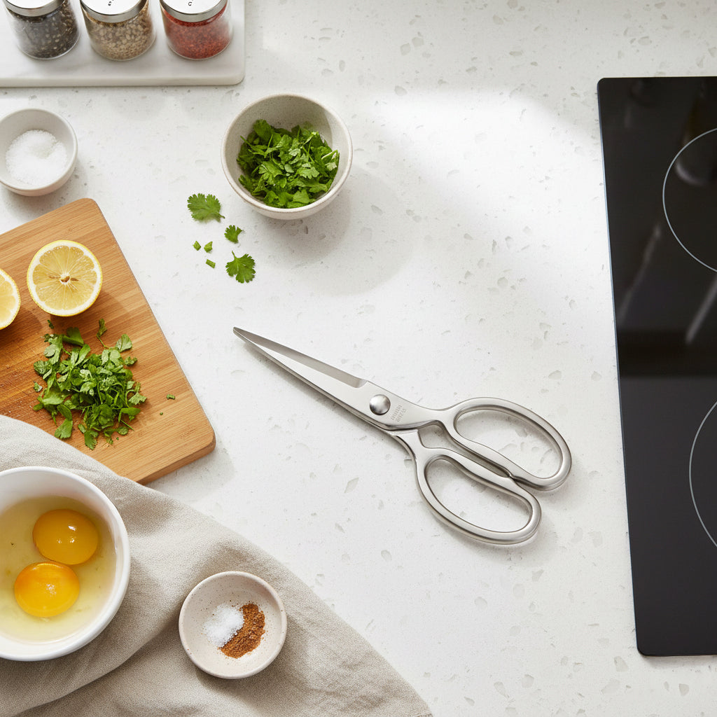 Fabriqués en acier inoxydable de haute qualité , ces ciseaux de cuisine sont résistants à la rouille et au ternissement. Ils conservent ainsi leur tranchant, leur esthétique et leur hygiène plus longtemps. Leur poignée ergonomique offre une prise en main confortable et convient aussi bien aux gauchers qu'aux droitiers. Grâce à la vis amovible, les ciseaux se démontent facilement pour un nettoyage complet.