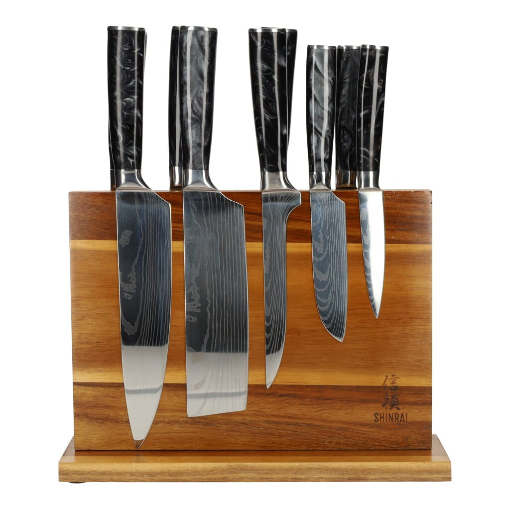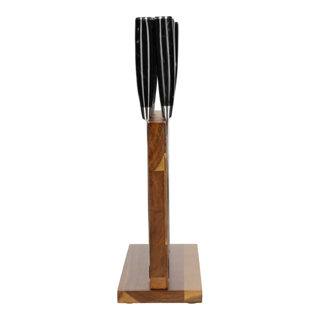 Ce bloc à couteaux en bois d'acacia est livré avec 9 couteaux de la série Epoxy Onyx qui conviennent à diverses tâches de coupe en cuisine. La combinaison de poignées époxy uniques et d'un bloc à couteaux en bois d'acacia en fait une véritable œuvre d'art.