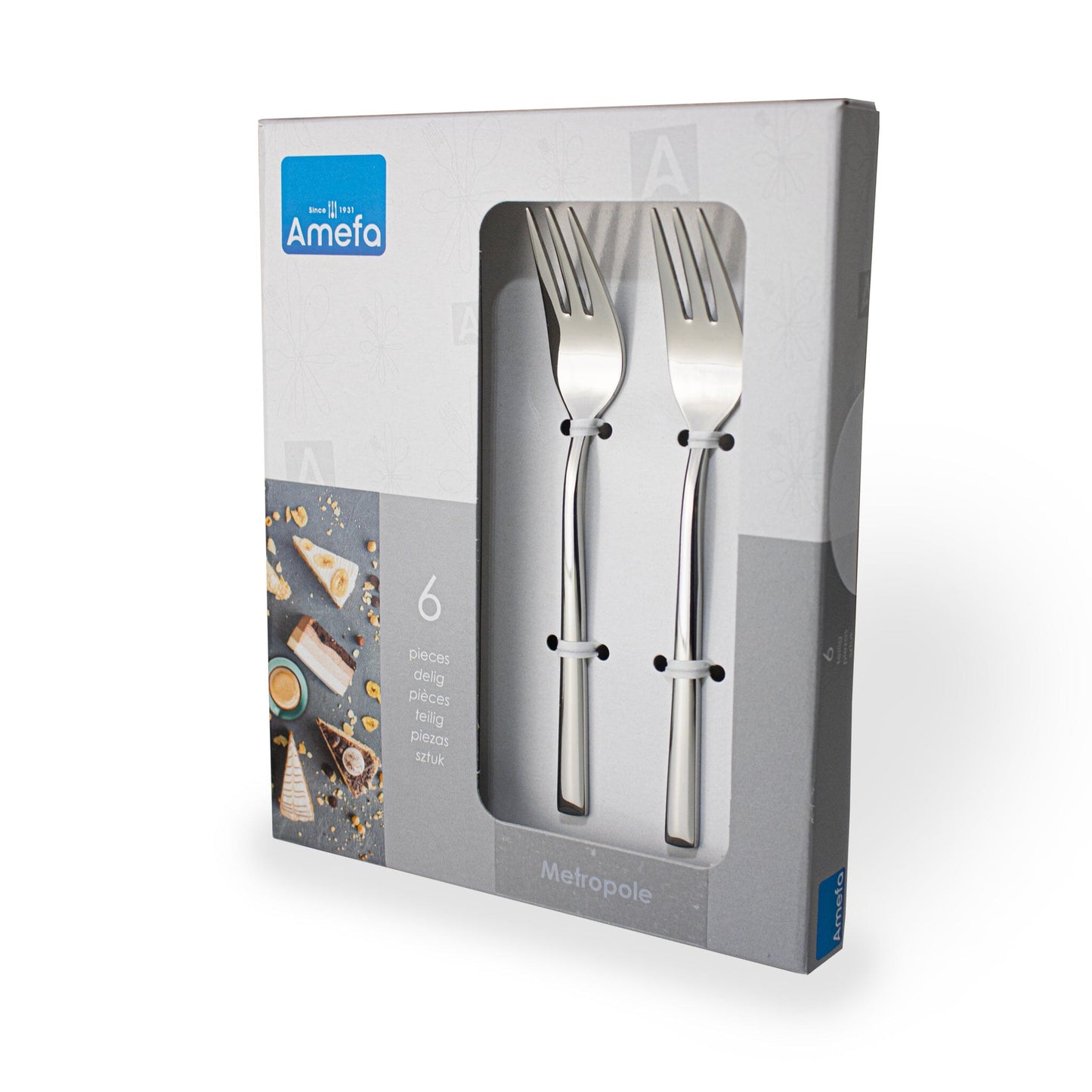 This Metropole cake fork set from the Amefa brand is a beautiful timeless cake fork set. The set has a slim and elegant design, with a sloping handle at the bottom. This design is inspired by modern city architecture and has a luxurious and contemporary look that is made of high-quality 18-10 stainless steel. The cutlery has a high-gloss finish and is suitable for cleaning in the dishwasher.