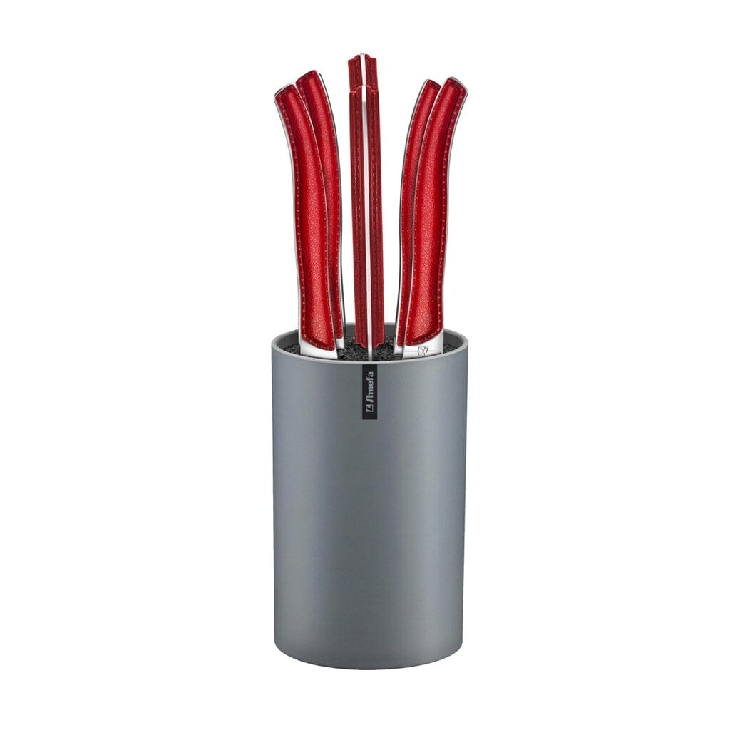 The Amefa Sky Lag 6 Steak knives + knife block in a red version is a beautiful addition to your table. Part of the well-known Sky Lag collection from Amefa, this cutlery set is known for its elegant finish and modern colors. The design is based on the traditional Laguiole style and is made of the highest quality stainless steel . Order the beautiful Amefa Sky Lag red 6-piece steak knife set in a leather version today and enjoy its high quality and long lifespan!