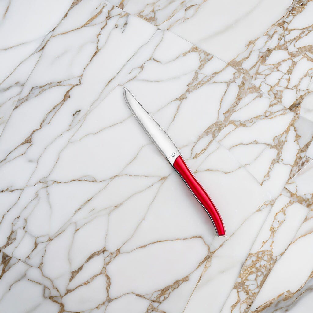 These steak knives with a striking red leather-look finish on the handles bring a perfect combination of classic and modern to the table. The traditional shape gives a unique look and the precisely applied serrations make cutting through all dishes effortless. Thanks to the characteristic French Laguiole design of these knives, with an eye for every detail, you create an atmosphere at the table and enjoy a delicious meal in style.