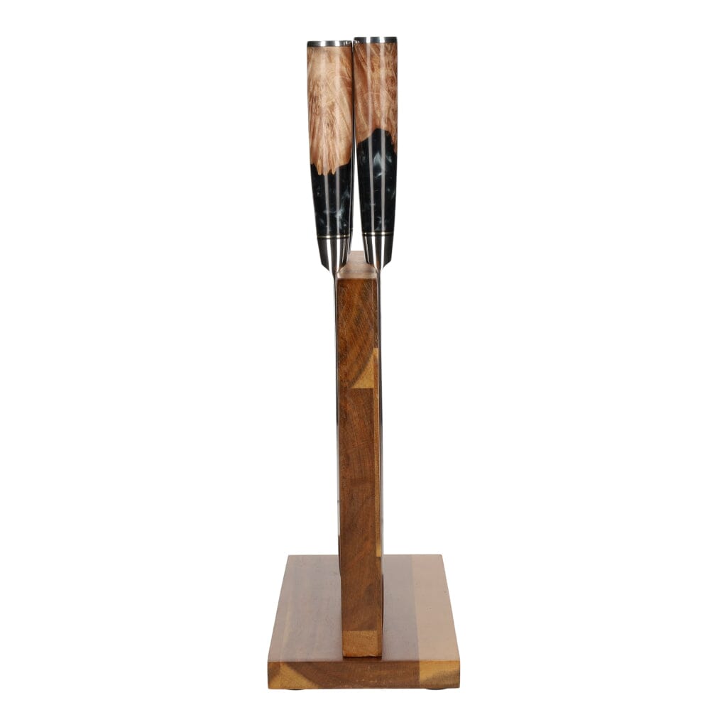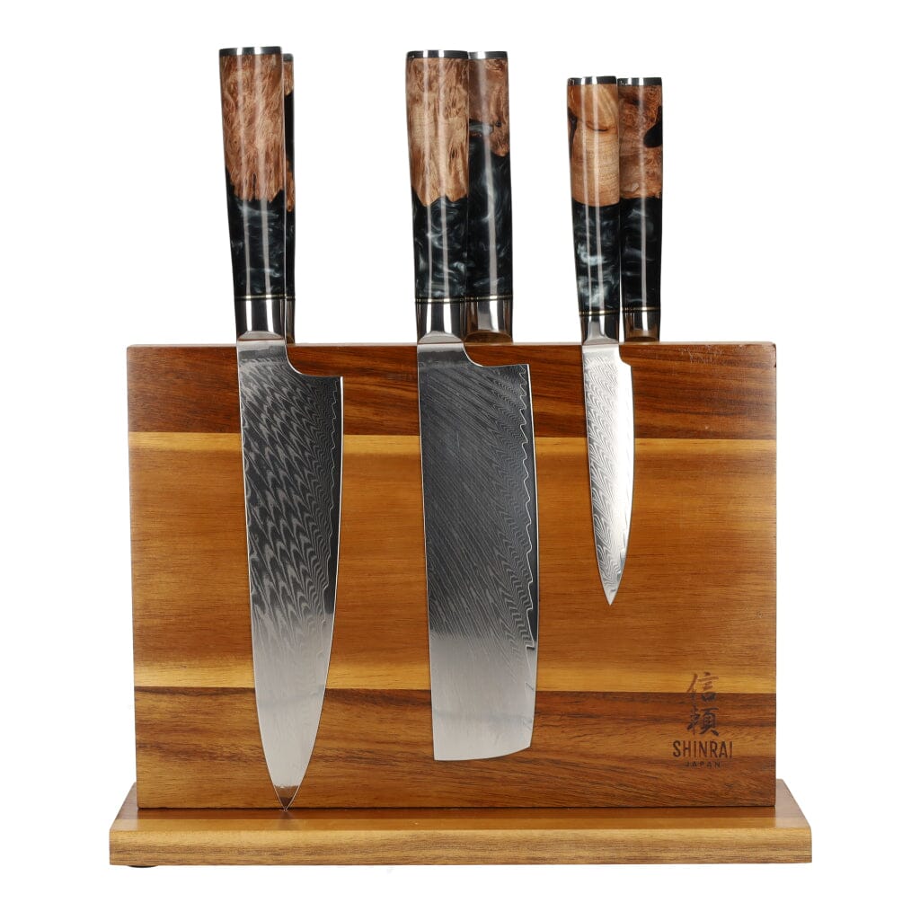 The Shinrai Epoxy Onyx Series 6-piece knife set is the perfect addition to your kitchen. Featuring a stylish double magnetic acacia wood knife block and six versatile knives, you'll always have the right knife at your fingertips for every cutting task and every dish.