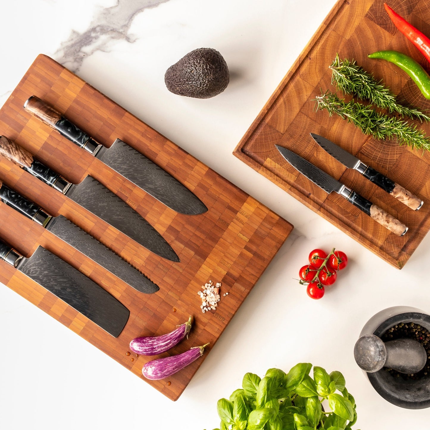 Store your knives in the double-sided magnetic acacia wood knife block. This prevents damage to the cutting edges and keeps your worktop organized and safe.