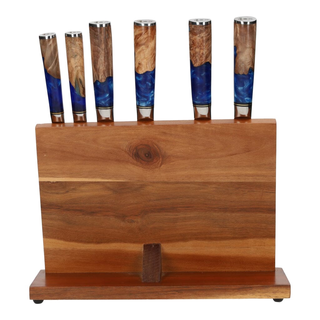 Epoxy Sapphire 6-delige Damascus Messenset + Acacia houder enkelzijdig