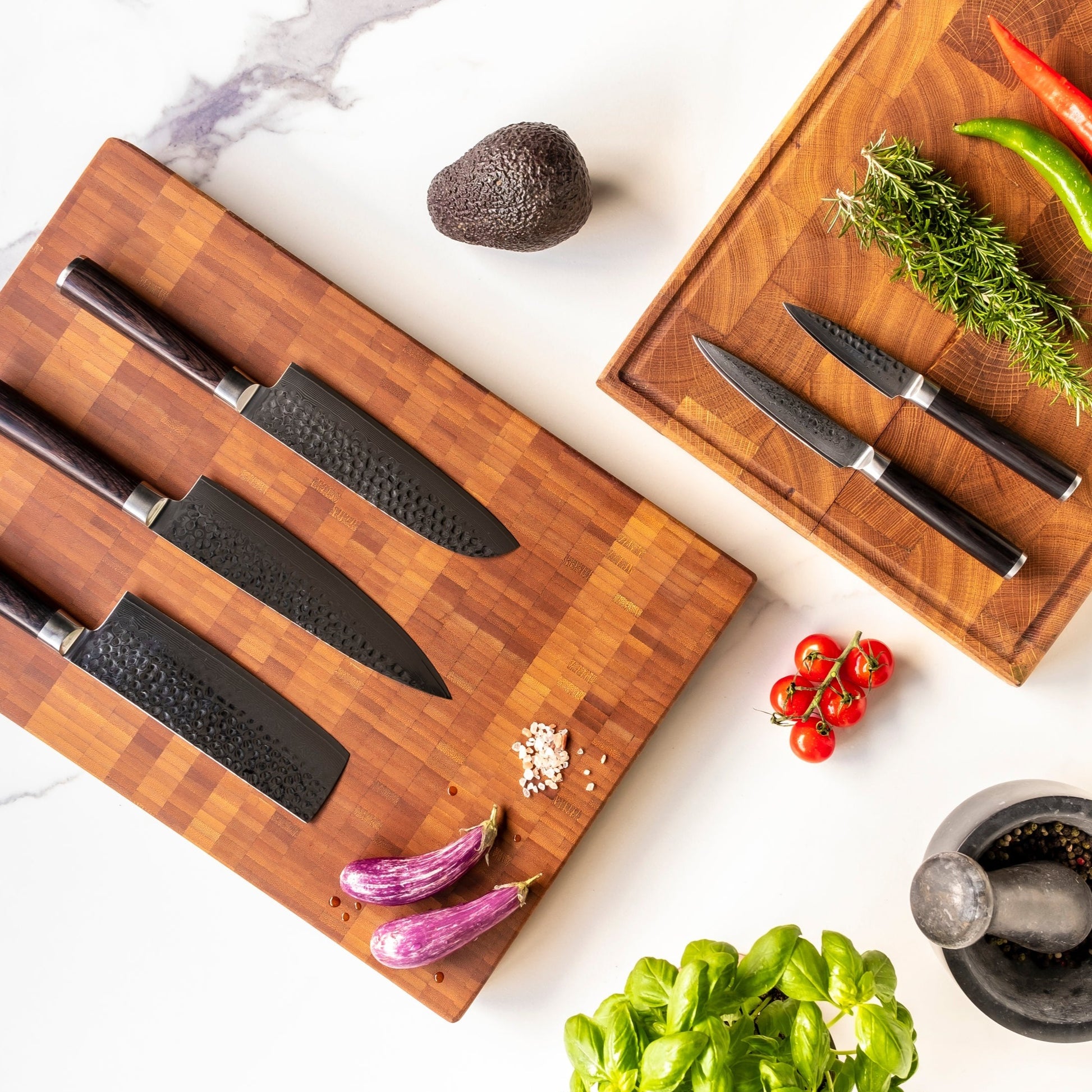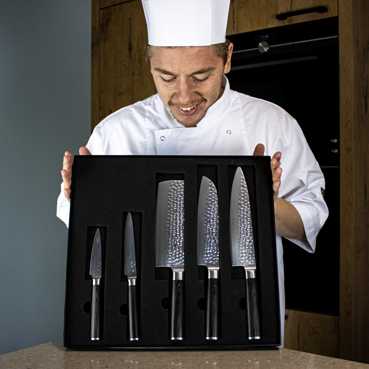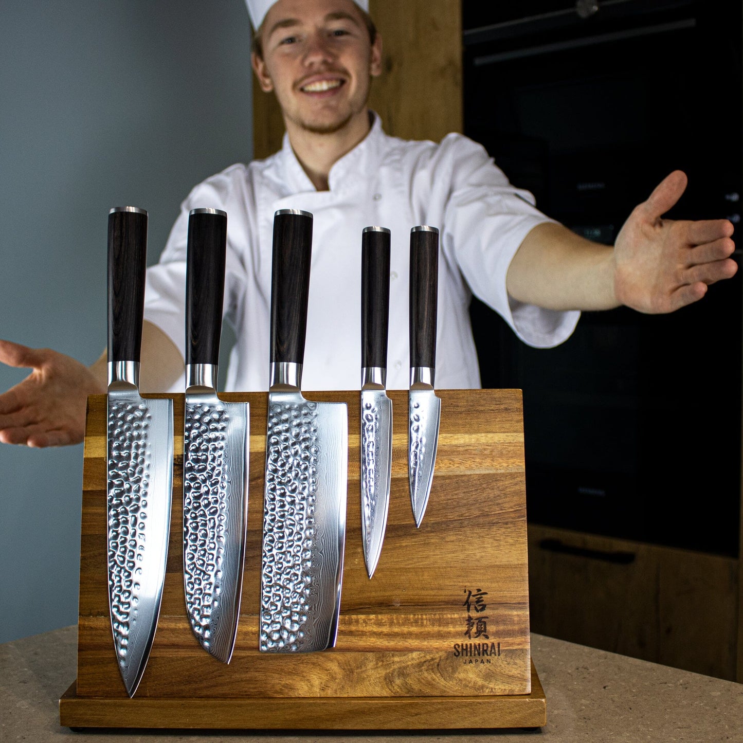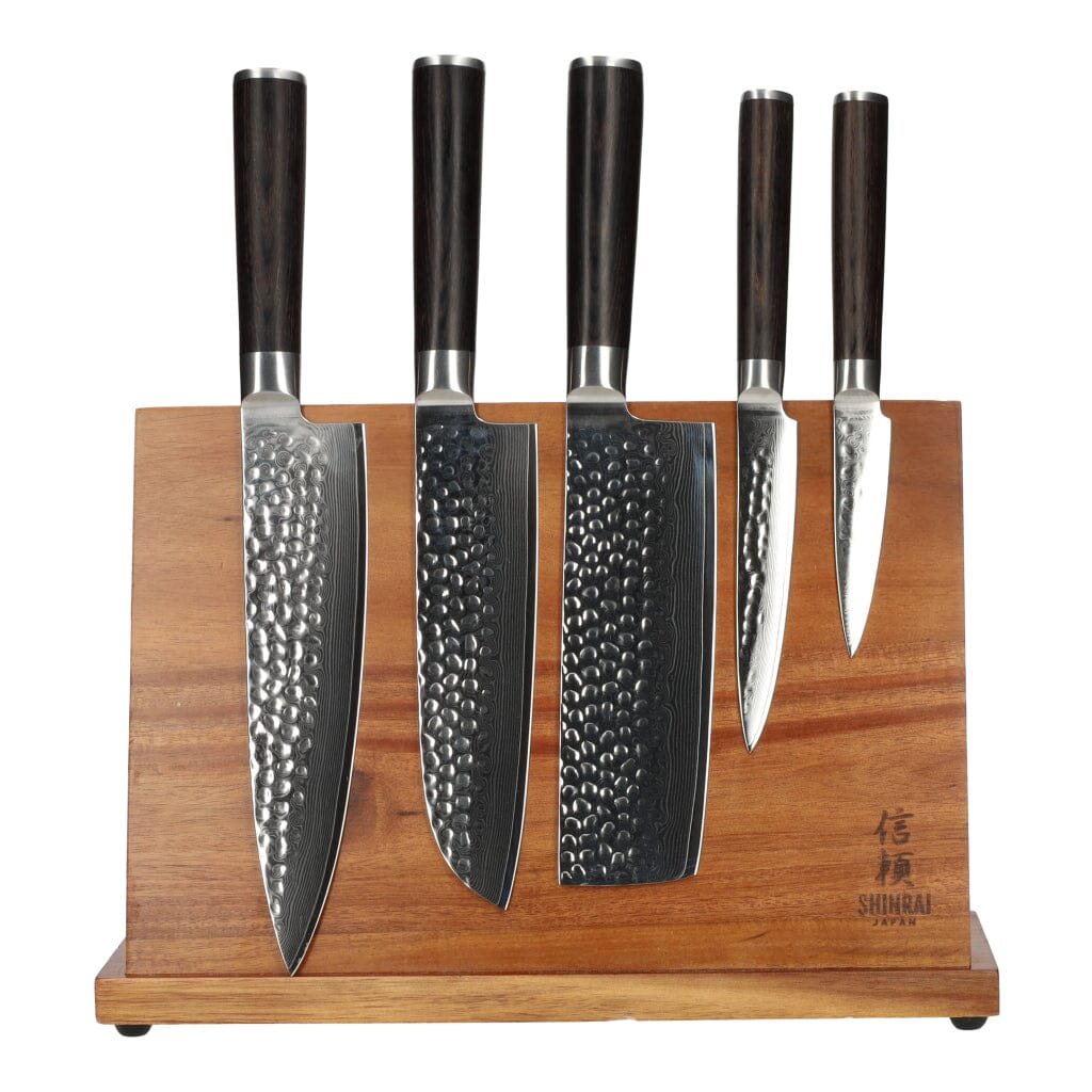 The Shinrai 5-piece Hammered Damask BR knife set with magnetic knife block is the perfect addition to your kitchen. This stylish combo combines functionality, craftsmanship, and design, ideal for the home chef who values quality and appearance.