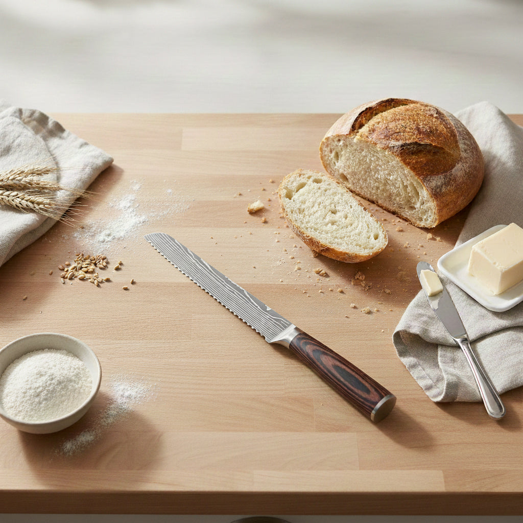 Experience the sharpness, balance, and look of a bread knife that can handle any cutting task. Order your Damascus Print Bread Knife from Shinrai today and make every cut a lot more enjoyable.