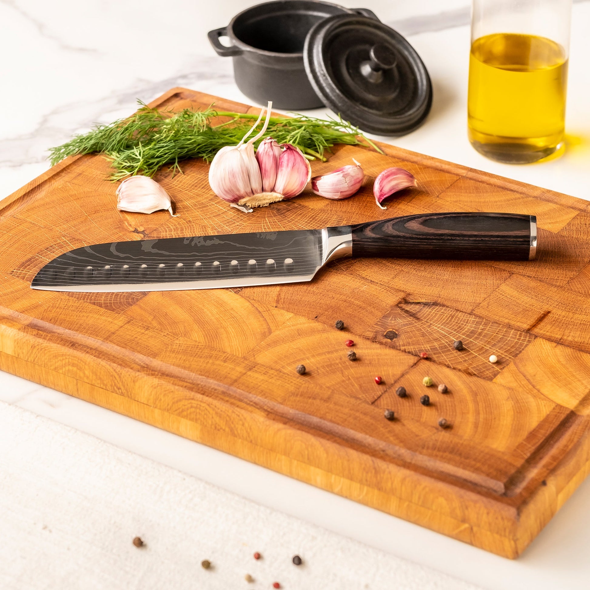 Preferably use a wooden cutting board to protect the blade and extend the life of your knives.